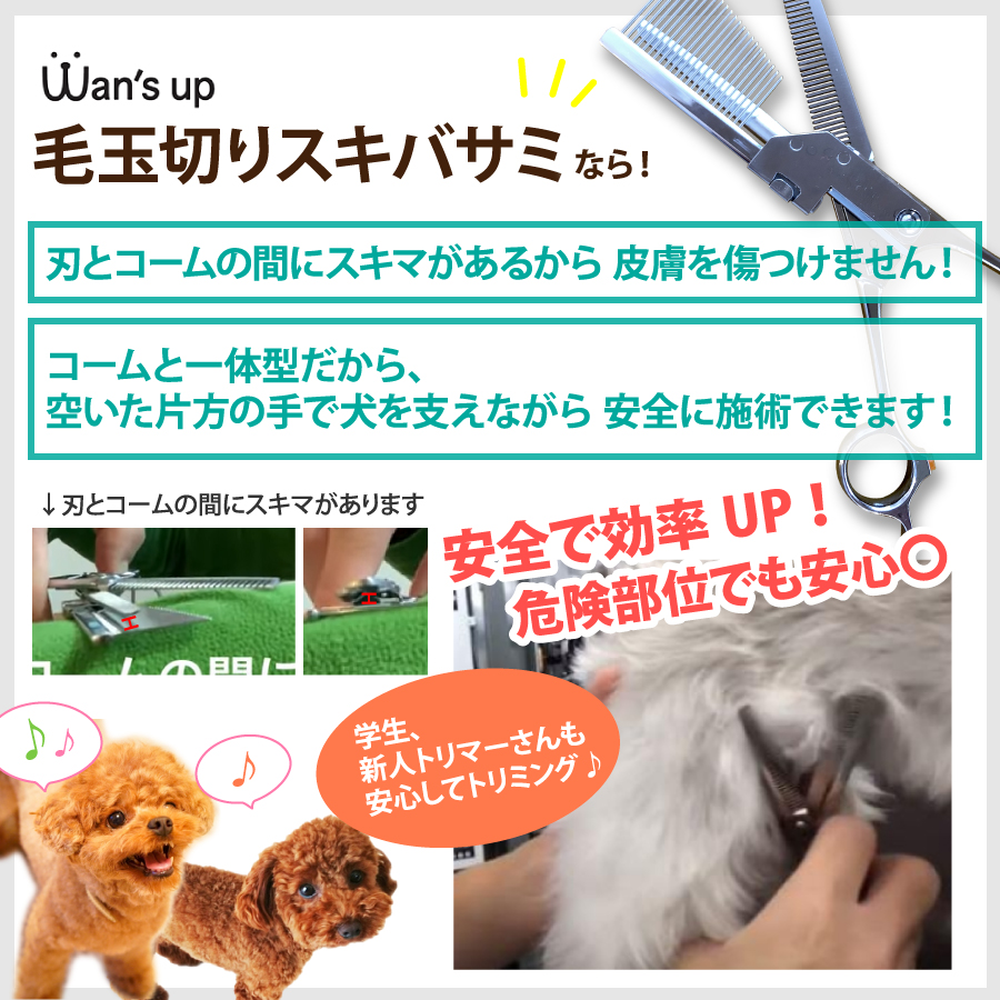 ベテラントリマーさんであればどんな状態の子でもケガさせることなく手早く毛玉を除去できますが、新人トリマーさんや学生さんがやりがちな皮膚を挟むケガを防ぐために、コームで皮膚と毛玉を分けられるよう工夫してあります。しかもスキバサミとコームが一体化しており、空いた片方の手で犬を安全に保定しながら施術できるから安心です!