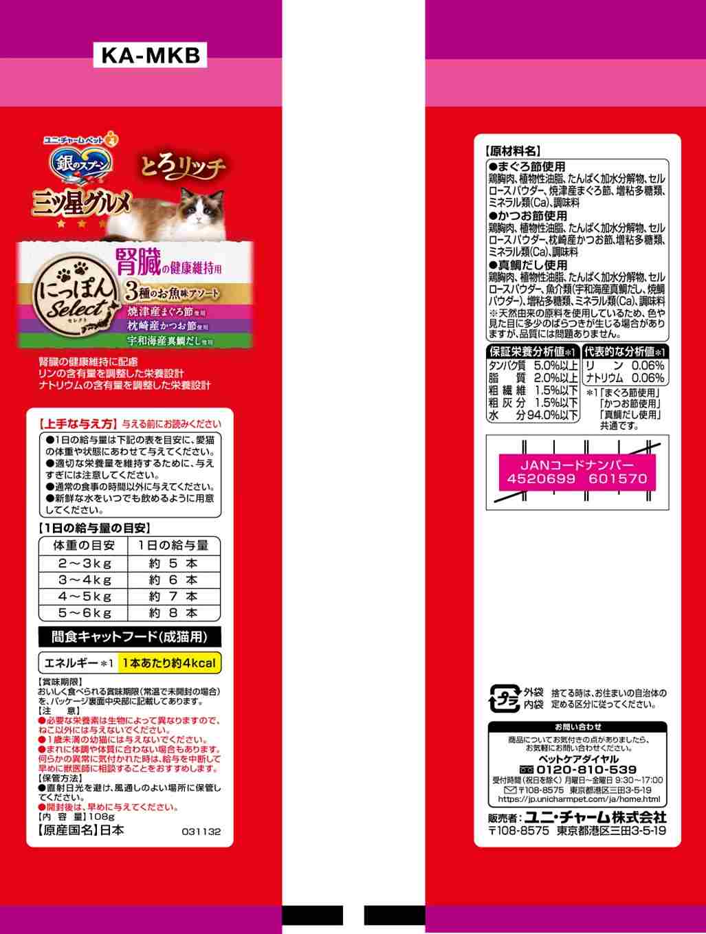 ・日本各地の「お取り寄せ」素材を使用した、とろ~りウェットタイプの上質なおやつ ・6gで食べきりサイズ ・国産、無着色 ・腎臓の健康維持に配慮した栄養設計。 ・ひと袋に3種類の味が詰まったアソートタイプ