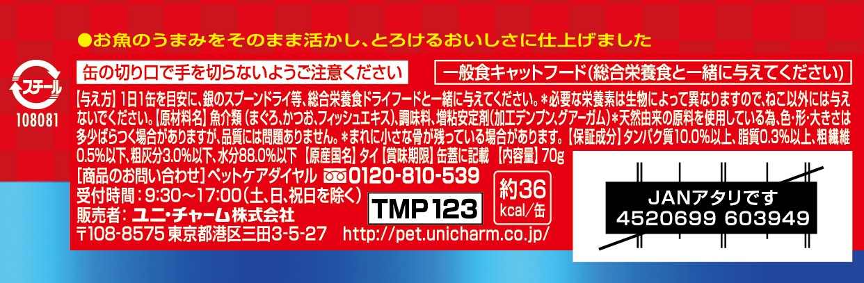 ●必要な栄養素は生物によって異なりますので、ねこ以外には与えないでください。●まれに体調や体質にあわない場合もあります。何らかの異常に気付かれた時は給与を中断し、早めに獣医師に相談することをおすすめします。●まれに小さな骨が残っている場合があります。