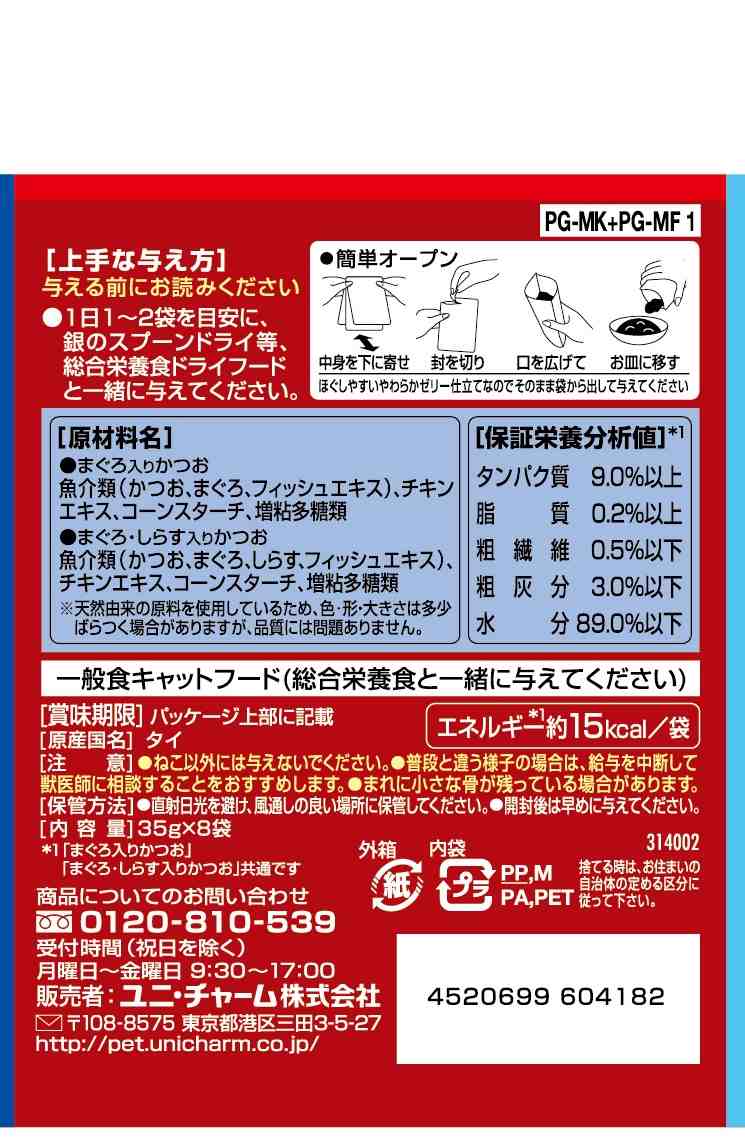 ●まぐろ入りかつお/魚介類(かつお、まぐろ、フィッシュエキス)、チキンエキス、コーンスターチ、増粘多糖類●まぐろ・しらす入りかつお/魚介類(かつお、まぐろ、しらす、フィッシュエキス)、チキンエキス、コーンスターチ、増粘多糖類※天然由来の原料を使用しているため、色・形・大きさは多少ばらつく場合がありますが、品質には問題ありません。