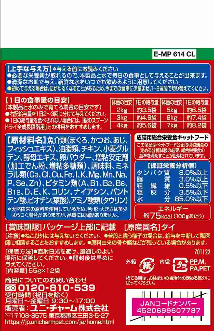 ・毎日の食事にも最適な栄養バランスの総合栄養食 ・たっぷりの身とうまみで抜群のおいしさを実現 ・55gパウチが1箱に12袋入ったパック