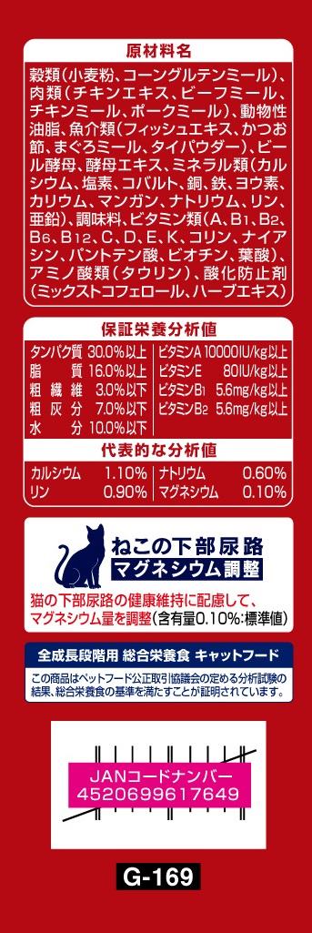 原材料穀類(小麦粉、コーングルテンミール)、肉類(ビーフミール、チキンエキス、チキンミール、ポークミール)、動物性油脂、魚介類(フィッシュエキス、かつお節、まぐろミール、タイパウダー)、ビール酵母、酵母エキス、ミネラル類(カルシウム、塩素、コバルト、銅、鉄、ヨウ素、カリウム、マンガン、ナトリウム、リン、亜鉛)、調味料、ビタミン類(A、B1、B2、B6、B12、C、D、E、K、コリン、ナイアシン、パントテン酸、ビオチン、葉酸)、アミノ酸類(タウリン)、酸化防止剤(ミックストコフェロール、ハーブエキス)