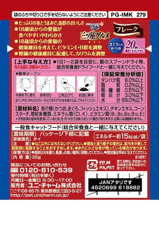 ・たっぷりの身とうまみで、抜群のおいしさを実現・18歳頃からの愛猫の健康維持を考えて、ビタミンE・B群を調整・腎臓の健康維持に配慮して、カリウムを調整・食べやすい小さめのフレーク・ほぐしやすいやわらかゼリー仕立て