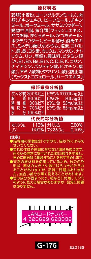 原材料穀類(小麦粉、コーングルテンミール)、肉類(チキンエキス、ビーフミール、チキンミール、ポークミール、ササミパウダー)、動物性油脂、魚介類(フィッシュエキス、かつお節、まぐろミール、かつおミール、ホタテパウダー)、ビール酵母、酵母エキス、ミネラル類(カルシウム、塩素、コバルト、銅、鉄、ヨウ素、カリウム、マンガン、ナトリウム、リン、亜鉛)、調味料、ビタミン類(A、B1、B2、B6、B12、C、D、E、K、コリン、ナイアシン、パントテン酸、ビオチン、葉酸)、アミノ酸類(タウリン)、酸化防止剤(ミックストコフェロール、ハーブエキス)