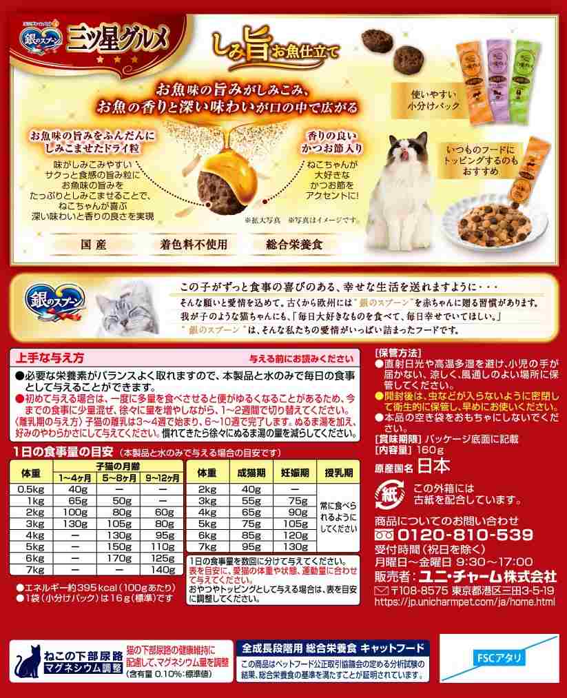 使用上の注意●猫専用の栄養設計ですので、猫以外には与えないでください。●まれに体質や体調に合わない場合もあります。何らかの異常に気付かれた時は給与を中断し、早めに獣医師に相談することをおすすめします。●天然の原材料を使用しているため、粒の色や形状、素材の大きさや数にばらつきがみられることがありますが、品質に問題はありません。血合い部分が黒く見えることがあります。●旨み成分が固まったり、粒などに付着してシミのように見える場合がありますが、品質に問題はありません。