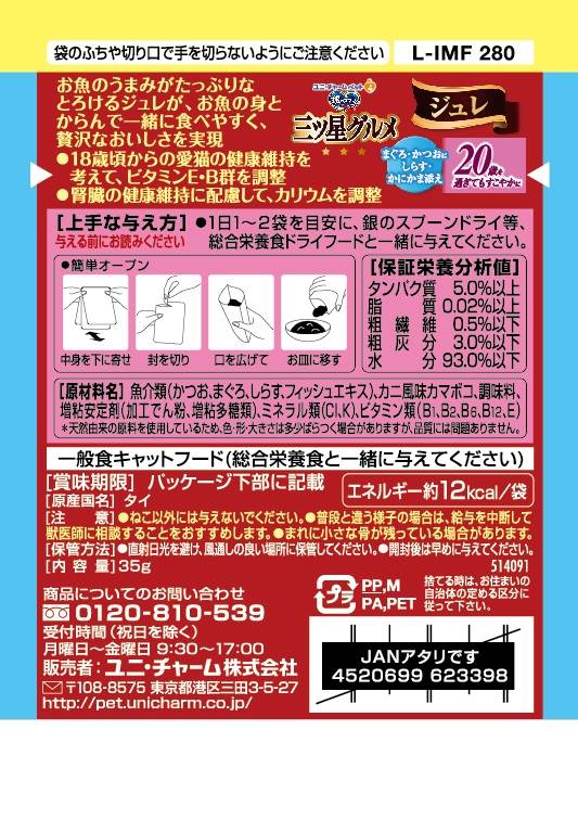 ・具と一緒に味わう贅沢な美味しさ・お魚の旨みがたっぷりなとろけるジュレが、お魚の身とからんで一緒に食べやすく、贅沢なおいしさを実現。・18歳頃からの愛猫の健康維持を考えて、ビタミンE・B群を調整・腎臓の健康維持に配慮して、カリウムを調整