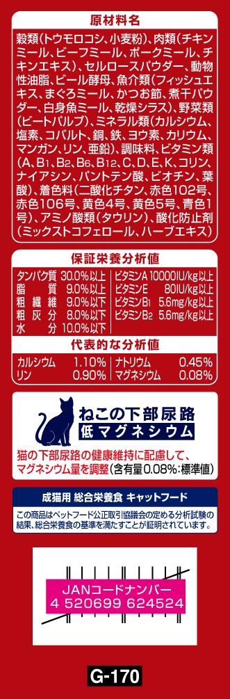 ・贅沢な素材の旨みたっぷりな、三ツ星のおいしさ ・独自の食物繊維配合技術で、お腹の中で粒がすばやくふやけて崩れるので、ドライフードを粒のまま吐き戻す事を軽減します ・毛づくろい等で飲み込んでしまった毛の排泄を助けるために、食物繊維を配合 ・猫の下部尿路の健康維持に配慮して、マグネシウム量を調整(含有量0.08%:標準値) ・おいしさと豊かな風味を逃さない、食べきり小分けパック16g(標準)×12袋