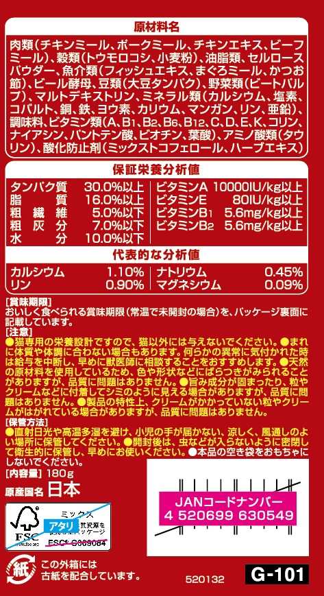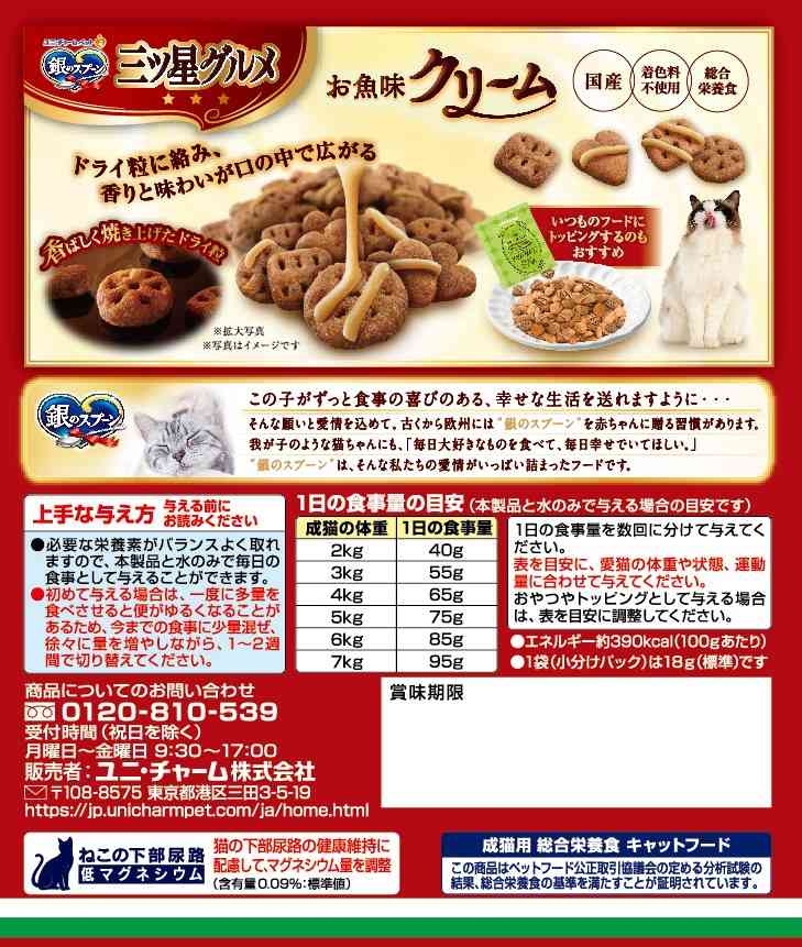 ・贅沢な素材の旨みたっぷりで、香ばしく焼き上げた三ツ星のおいしさ ・ドライ粒にクリームを絡めて、今までにない味わいを実現 ・着色料不使用 ・成猫用総合栄養食 ・おいしさと豊かな風味を逃さない、食べきり小分けパック18g(標準)×10袋