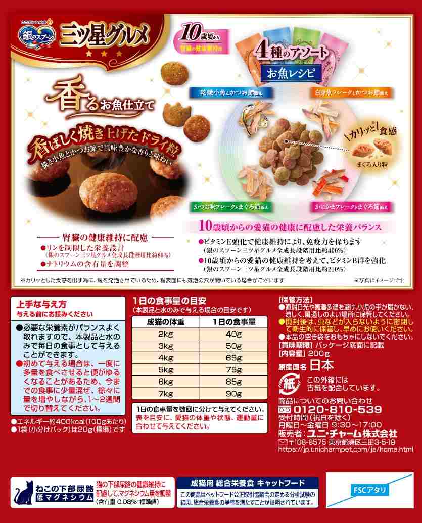 ・猫ちゃんが喜ぶお魚のおいしさがひと箱に4種類詰まった贅沢な逸品 ・腎臓の健康維持に配慮して、リンを制限した栄養設計* ・腎臓の健康維持に配慮して、ナトリウムの含有量を調整 ・ビタミンE強化で健康維持により、免疫力を保ちます※ ・猫の下部尿路の健康維持に配慮して、マグネシウム量を調整(含有量0.08%:標準値) ※銀のスプーン三ツ星グルメ全成長段階用比