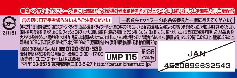 ・使いやすい便利なミニ缶サイズ(70g)・15歳頃からの愛猫の健康維持を考えて、ビタミンE・B群を調整・腎臓の健康維持に配慮して、カリウムを調整・お腹の健康維持に配慮して、オリゴ糖を配合・食べやすい小さめフレーク・まぐろ・発色剤不使用