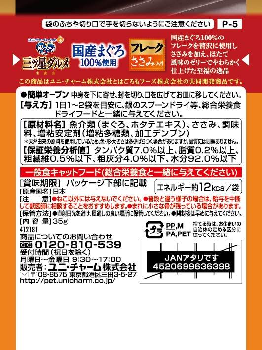 魚介類(まぐろ、ホタテエキス)、ささみ、調味料、増粘安定剤(増粘多糖類、加工デンプン)