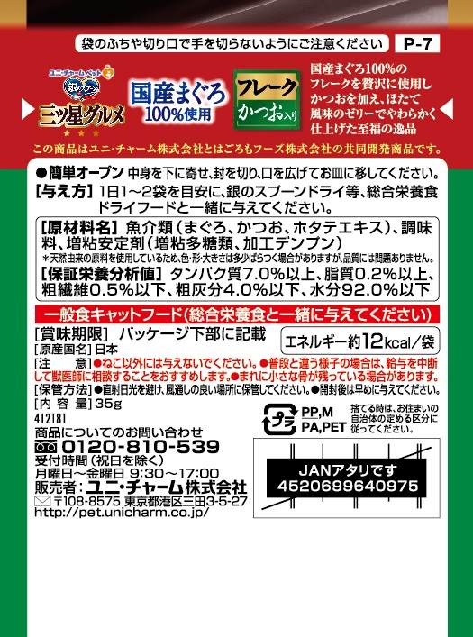 魚介類(まぐろ、かつお、ホタテエキス)、調味料、増粘安定剤(増粘多糖類、加工デンプン)