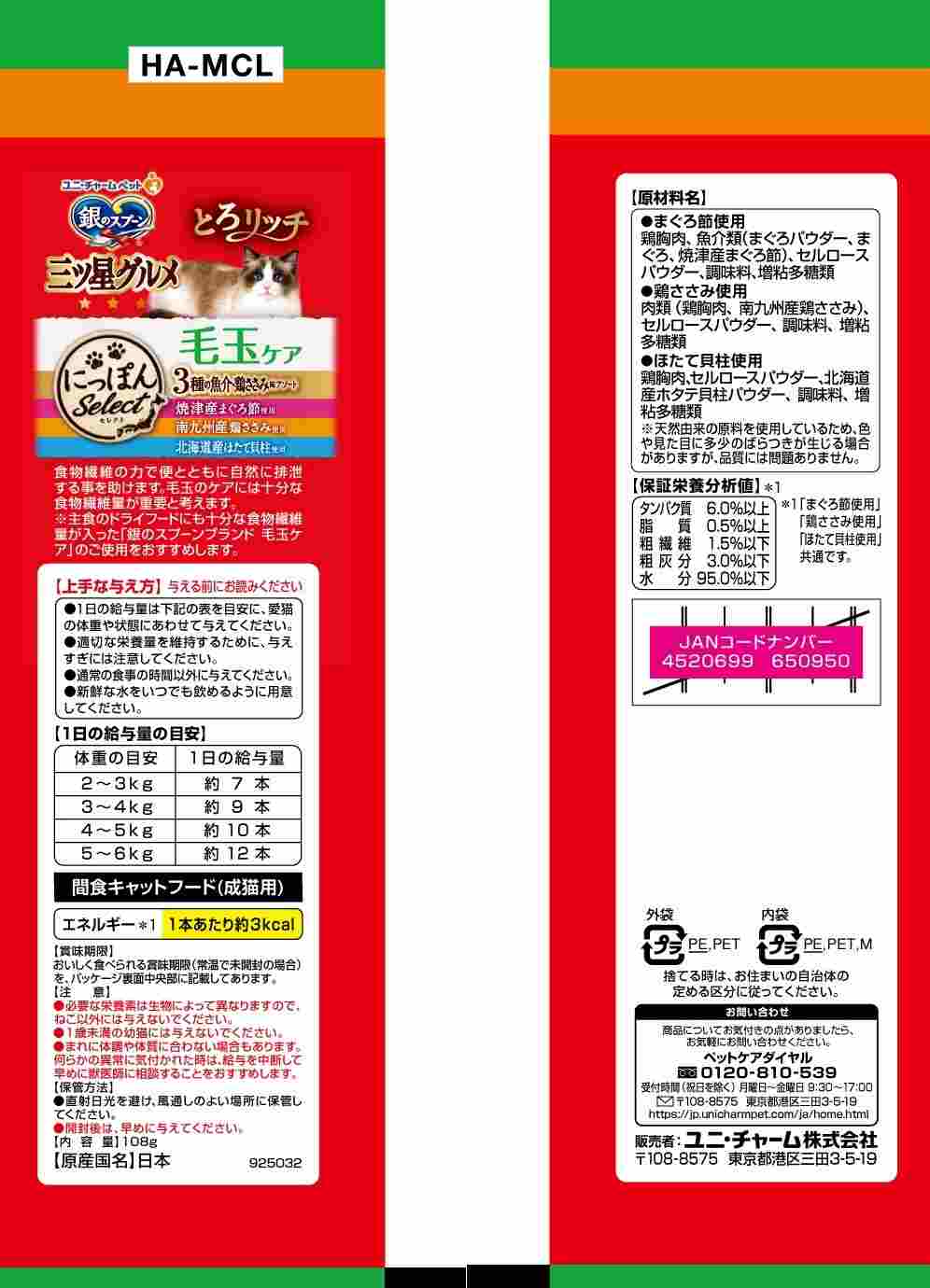 銀のスプーン 三ツ星グルメ おやつにっぽんselectとろリッチ毛玉ケア3種まぐろ&鶏ささみ&ほたて 108g
