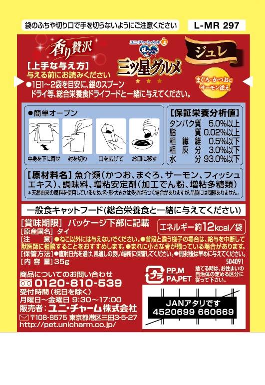 魚介類(かつお、まぐろ、サーモン、フィッシュエキス)、調味料、増粘安定剤(加工でん粉、増粘多糖類)