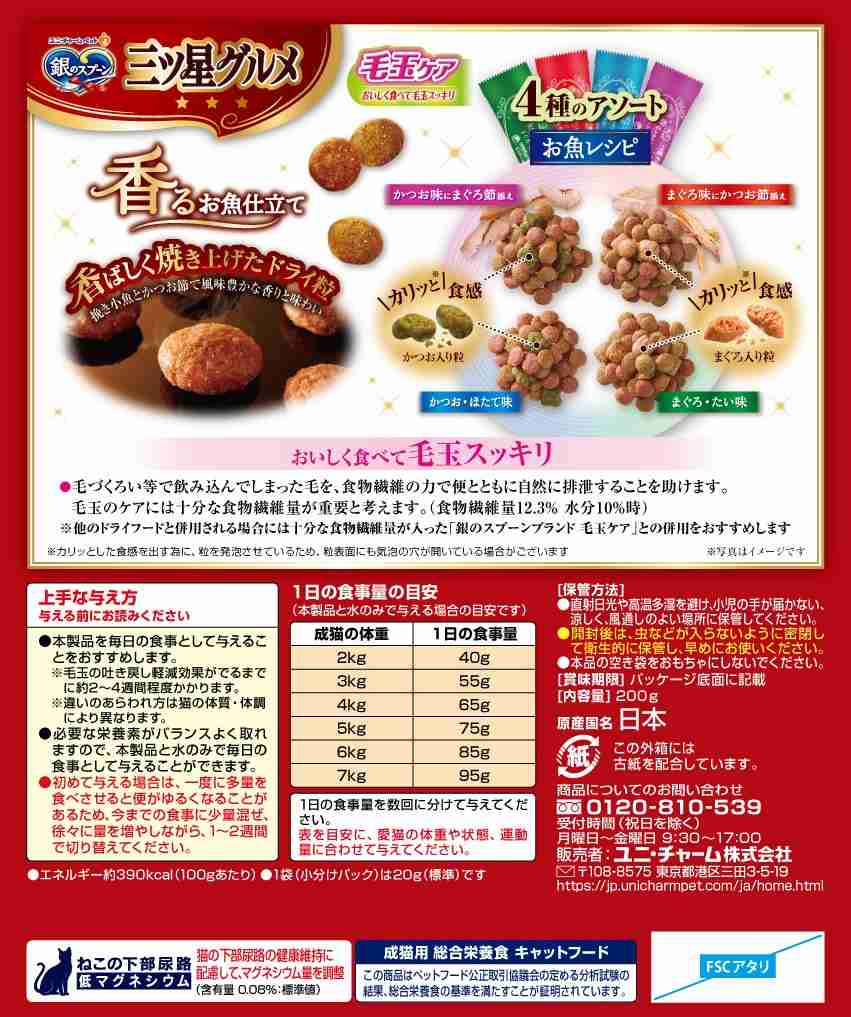 ・猫ちゃんが喜ぶお魚のおいしさがひと箱に4種類詰まった贅沢な逸品 ・カリッと食感の粒が入って、色々な食感が楽しめます。 ・毛づくろい等で飲み込んでしまった毛の排泄を助けるために、食物繊維を配合 ・猫の下部尿路の健康維持に配慮して、マグネシウム量を調整(含有量:0.08%:標準値) ・おいしさと豊かな風味を逃さない、食べきり小分けパック20g(標準)×10袋