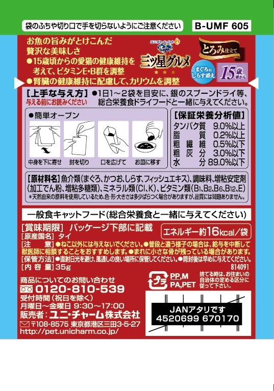 ・お魚フレークの具材が食べやすいとろみ仕立て ・たっぷり入ったお魚フレークがとろみスープにからんで食べやすい・15歳頃からの愛猫の健康維持を考えて、ビタミンE・B群を調整。・腎臓の健康維持に配慮して、カリウムを調整。