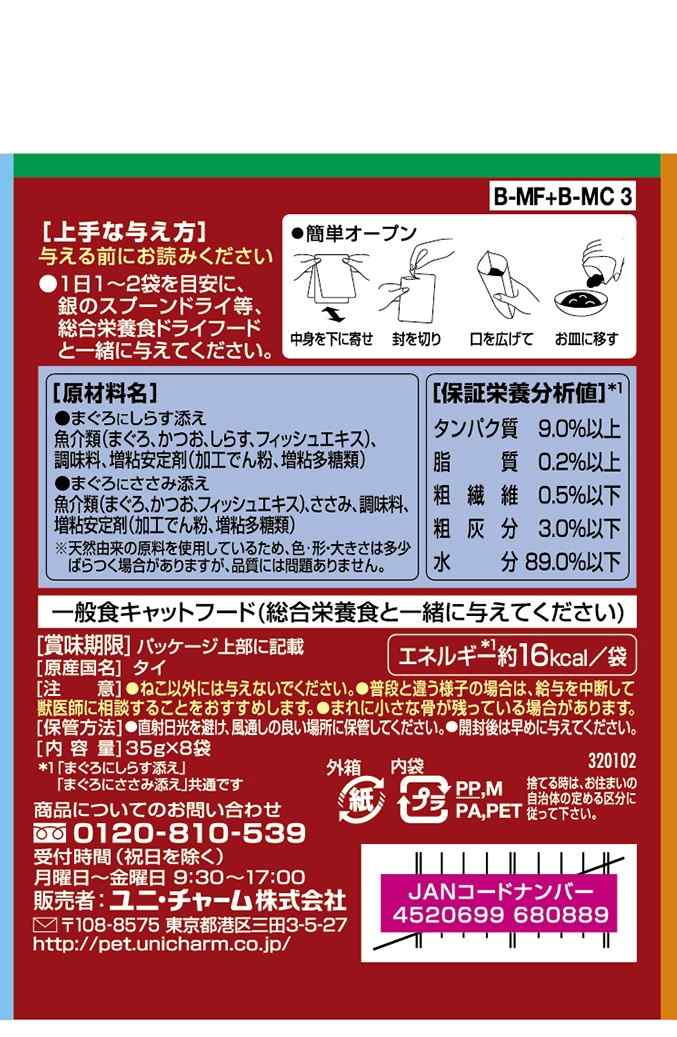 ●まぐろにしらす添え:魚介類(まぐろ、かつお、しらす、フィッシュエキス)、調味料、増粘安定剤(加工でん粉、増粘多糖類)●まぐろにささみ添え:魚介類(まぐろ、かつお、フィッシュエキス)、ささみ、調味料、増粘安定剤(加工でん粉、増粘多糖類)※天然由来の原料を使用しているため、色・形・大きさは多少ばらつく場合がありますが、品質には問題ありません。