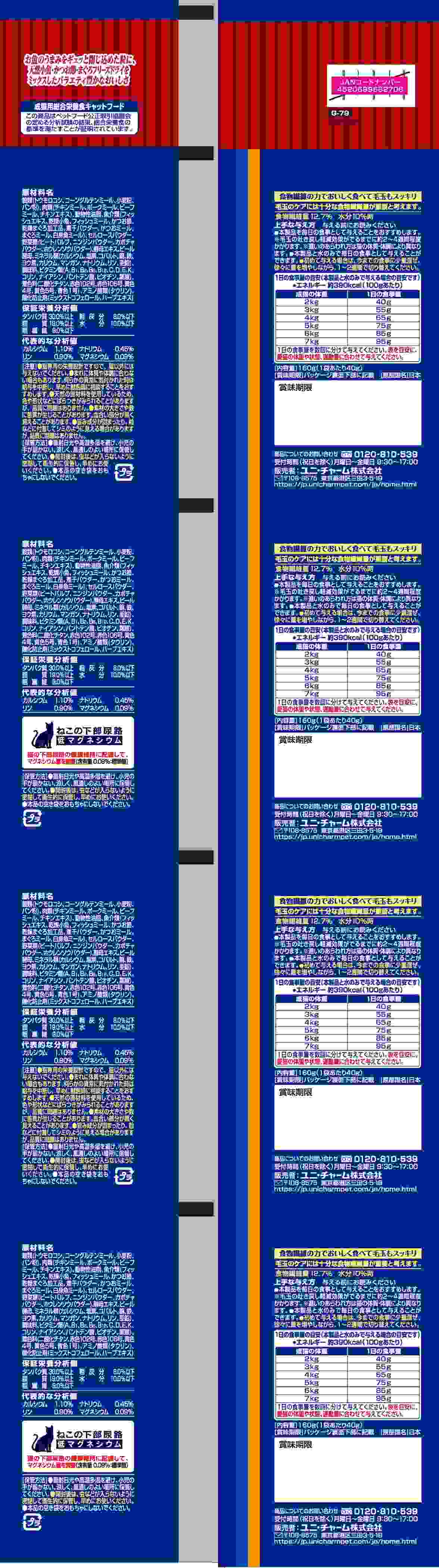 ・お魚のうまみをたっぷり閉じ込めた粒に、天然小魚やかつお節、まぐろフリーズドライをミックスしたバラエティ豊かなおいしさ・毛づくろい等で飲み込んでしまった毛の排泄を助けるために、食物繊維を配合・猫の下部尿路の健康維持に配慮して、マグネシウム量を調整(含有量0.09%:標準値)