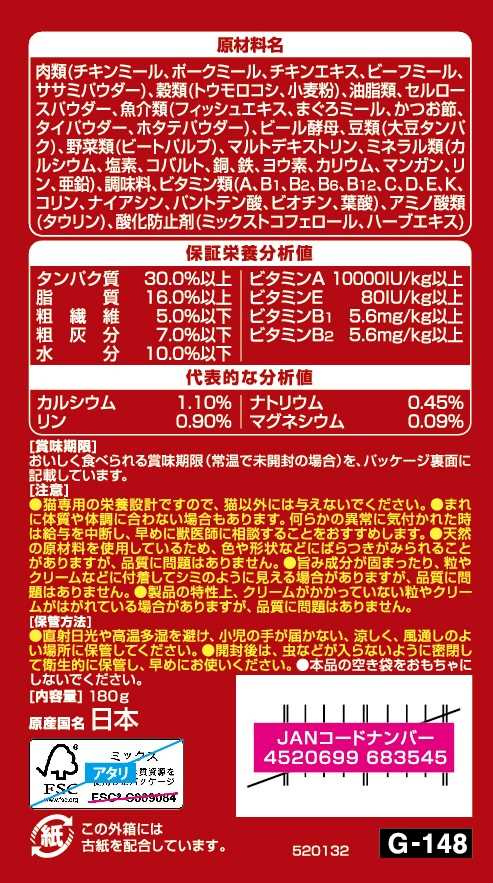 原材料肉類(チキンミール、ビーフミール、ポークミール、チキンエキス、ササミパウダー)、穀類(トウモロコシ、小麦粉)、油脂類、セルロースパウダー、魚介類(フィッシュエキス、まぐろミール、かつお節、タイパウダー、ホタテパウダー)、ビール酵母、豆類(大豆タンパク)、野菜類(ビートパルプ)、マルトデキストリン、ミネラル類(カルシウム、塩素、コバルト、銅、鉄、ヨウ素、カリウム、マンガン、リン、亜鉛)、調味料、ビタミン類(A、B1、B2、B6、B12、C、D、E、K、コリン、ナイアシン、パントテン酸、ビオチン、葉酸)、アミノ酸類(タウリン)、酸化防止剤(ミックストコフェロール、ハーブエキス)