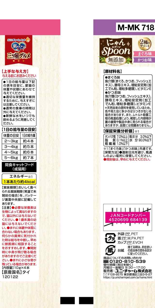 ・こぼれにくくて、ねこちゃんが食べやすいスプーンタイプ ・お魚をすりつぶしたとろ~りウェットタイプのおやつ ・10gで食べきりサイズ ・ひと袋に2種類の味が詰まったアソートタイプ ・無添加(調味料・着色料不使用)