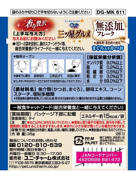 魚介類(かつお、まぐろ)、酵母エキス、コーンスターチ、増粘多糖類、※天然由来の原料を使用しているため、色・形・大きさは多少ばらつく場合がありますが、品質には問題ありません。
