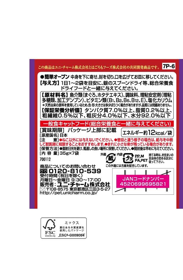 魚介類(まぐろ、ホタテエキス)、調味料、増粘安定剤(増粘多糖類、加工デンプン)、ビタミン類(B1、B2、B6、B12、E)、塩化カリウム*天然由来の原料を使用しているため、色・形・大きさは多少ばらつく場合がありますが、品質には問題ありません。