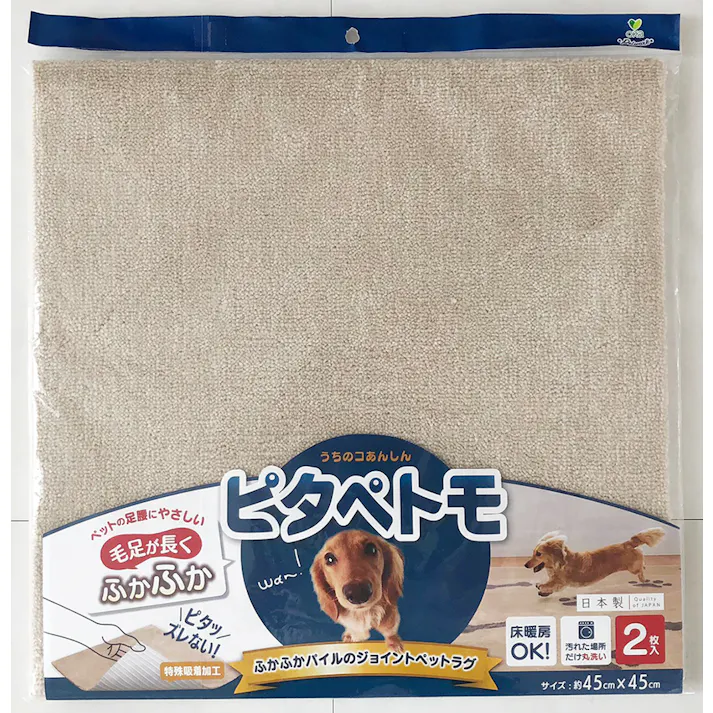 ツルッとすべって足腰に負担がかかってしまうフローリングを草原を思いっきり走り回っているようなふかふかラグへ変えてくれるペットラグ「ピタペトモ」。ペットと人が暮らす空間をもっと快適にしたいそんな想いから生まれたペットウェアです。滑って転んだりしてケガをしてしまったり、老犬の足腰への負担や冷えを和らげてくれるふかふかのペットラグは、床暖房にも使用できるのでペットはもちろん家族みんなが快適に過ごせるラグ仕様。裏面は吸着シートだから走り回ってもOK。掃除機をかけてもずれません。汚れたところだけ洗えるので、サッと取り外して洗濯機で簡単お手入れ可能。だからトイレまわりはもちろんケージ内や外にも。コーディネイト次第でカーペットのようなインテリアの邪魔をしないシンプルなモノトーン調のラグとしてもご使用いただけます。