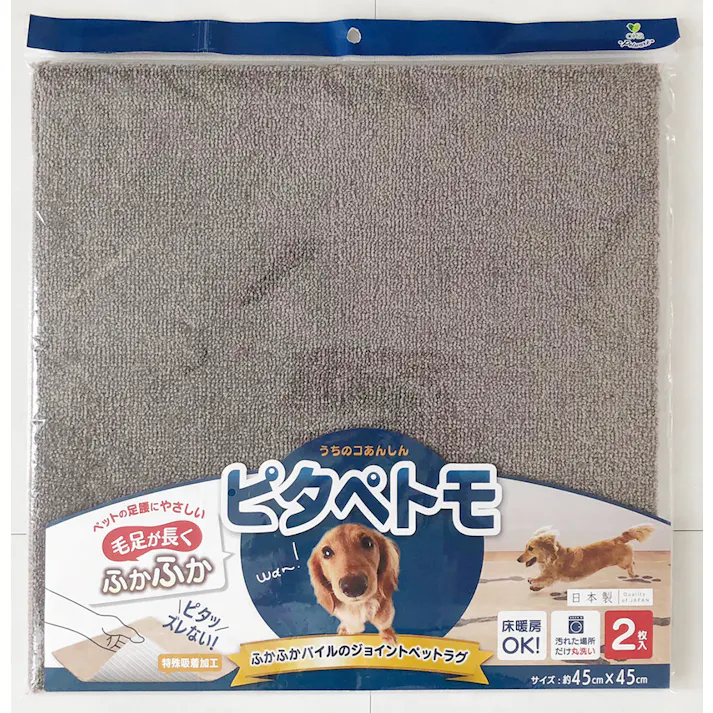ツルッとすべって足腰に負担がかかってしまうフローリングを草原を思いっきり走り回っているようなふかふかラグへ変えてくれるペットラグ「ピタペトモ」。ペットと人が暮らす空間をもっと快適にしたいそんな想いから生まれたペットウェアです。滑って転んだりしてケガをしてしまったり、老犬の足腰への負担や冷えを和らげてくれるふかふかのペットラグは、床暖房にも使用できるのでペットはもちろん家族みんなが快適に過ごせるラグ仕様。裏面は吸着シートだから走り回ってもOK。掃除機をかけてもずれません。汚れたところだけ洗えるので、サッと取り外して洗濯機で簡単お手入れ可能。だからトイレまわりはもちろんケージ内や外にも。コーディネイト次第でカーペットのようなインテリアの邪魔をしないシンプルなモノトーン調のラグとしてもご使用いただけます。