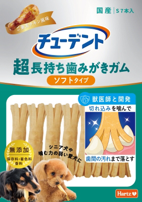 一度細かく砕いた牛皮をロール状に巻いた、程よい噛み心地のソフトタイプ“超長持ち”歯みがきガム。