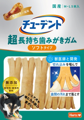 一度細かく砕いた牛皮をロール状に巻いた、程よい噛み心地のソフトタイプ“超長持ち”歯みがきガム。