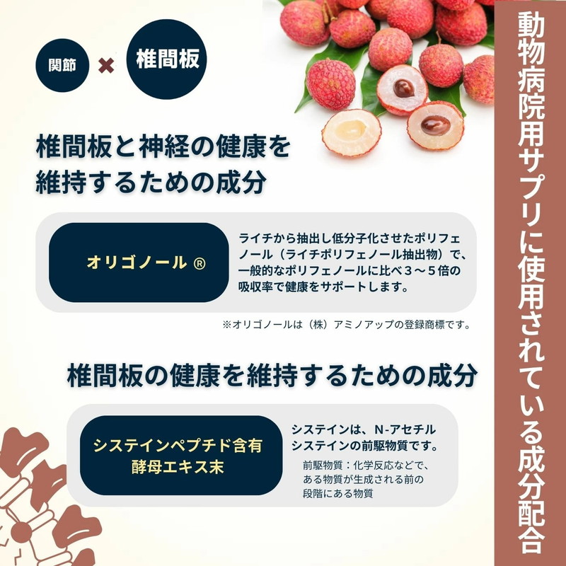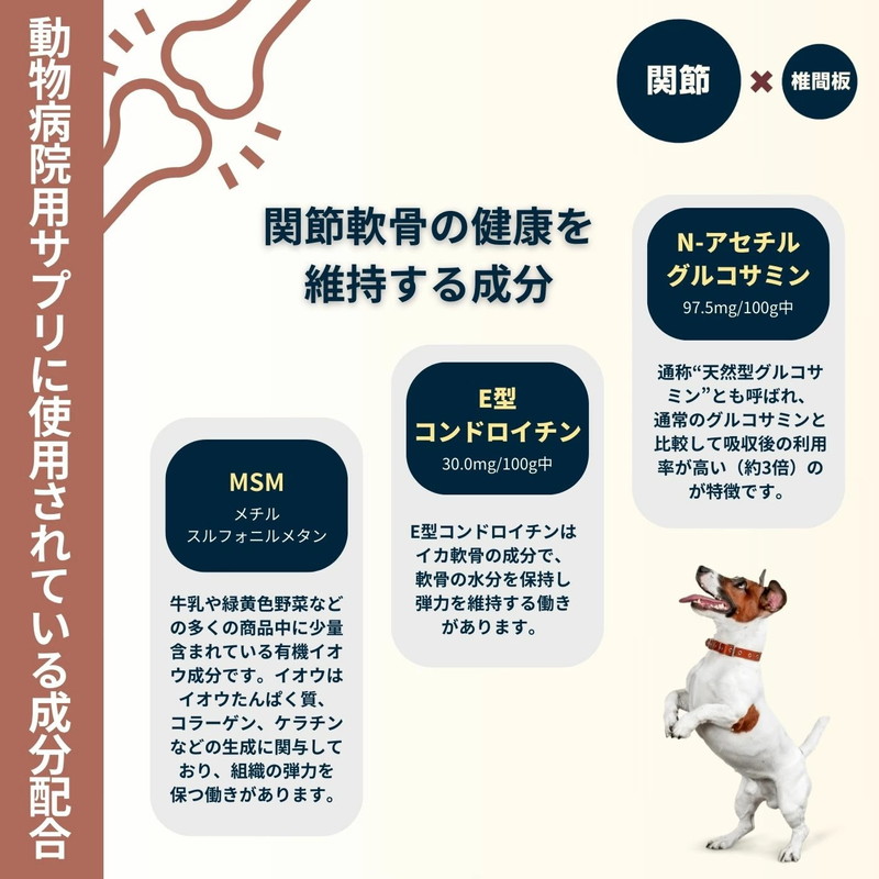 動物病院用サプリメントに配合している椎間板の健康と、関節の健康を維持する成分配合