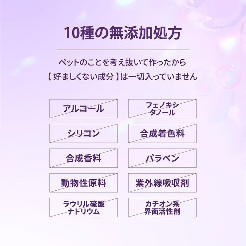 ●ペットの体から20‐30cm程離してスプレーし、ブラッシングをしてください。●ペットの顔に使用する時はコットン等に含ませてください。●除菌・消臭時は製品に直接スプレーしてください。