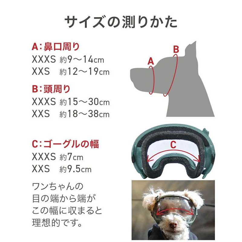 【使用方法】冬の雪遊び、夏の水遊びドライブなど一年中お使いいただけます。レンズはクリア&スモークの2色セットです。鼻口周り9cm~14cm頭周り15cm~30cm。推奨犬種:ミニチュアピンシャー、カニンヘンダックスフンド、チワワ、ティーカッププードル、タイニープードル、ヨークシャテリアなどその他体重3キロ未満の超小型犬