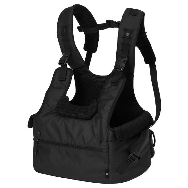 ペットの体重を分散し、肩や腰への負担を軽減する前抱き専用キャリーバッグ。 幅広のショルダーベルトとウエストベルトでしっかりホールド。長時間のお出かけも快適です。付属のキャリーカバーを取り付けることで外界の刺激からペットを守り、中の様子を確認できる前抱きスタイルで安心して移動できます。※ 通気性抜群のメッシュ素材でペットもオーナーも快適。 収納ポケットも充実しているので、おやつやお手入れグッズなど、必要なものをまとめて収納できます。 本体および各種パーツは洗濯ネットに入れて洗濯可能で衛生的。 ※本製品を交通機関で使用する場合、それぞれの交通機関によって「運送約款」が定められておりますので、ご利用になる各交通機関にお問い合わせください。
