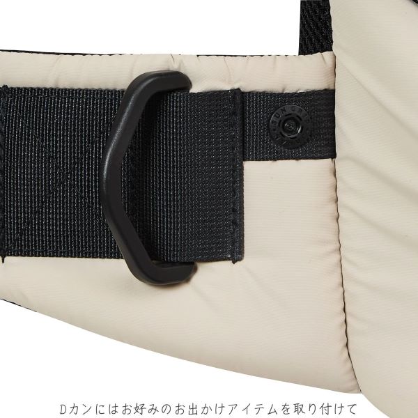 幅広のショルダーベルトとウエストベルトでしっかりホールド。