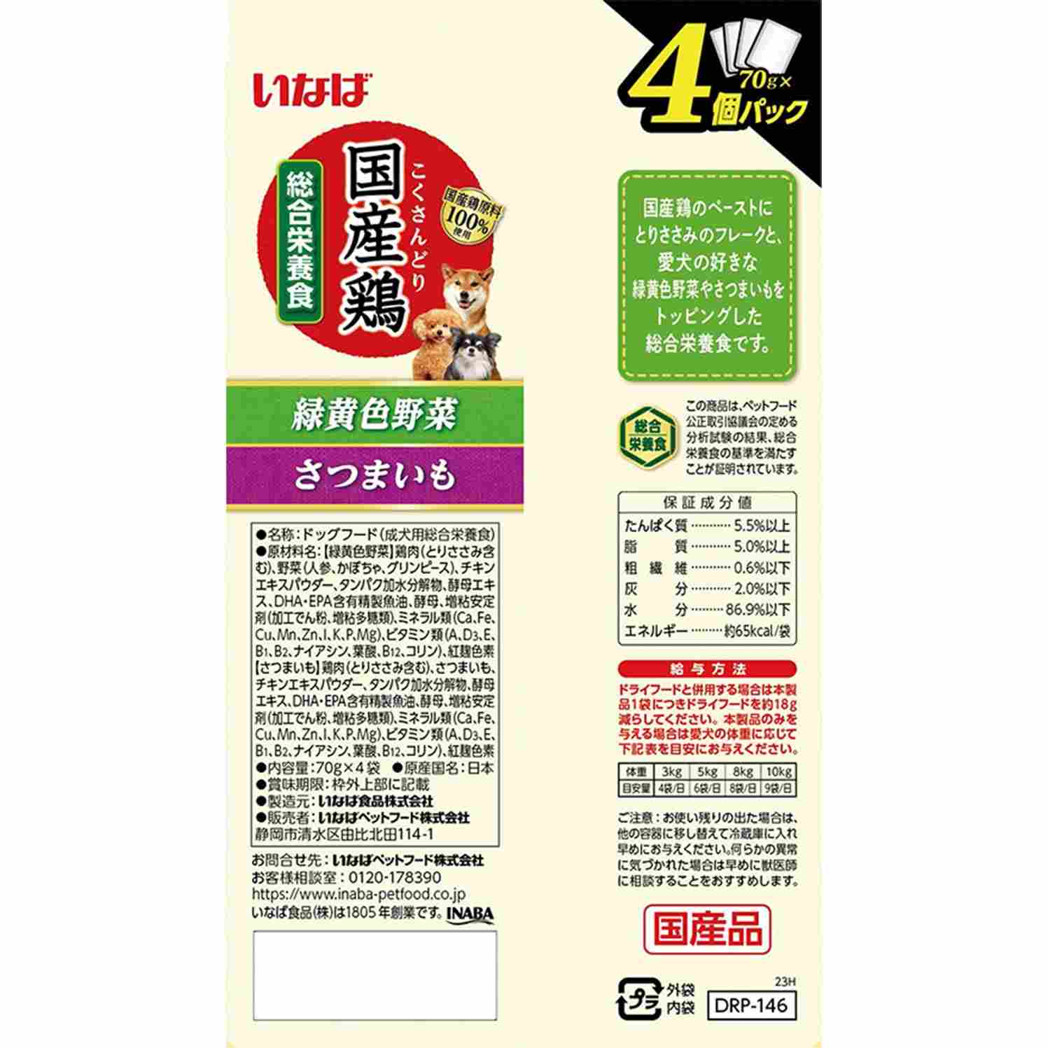 国産鶏のペーストにとりささみのフレークと、緑黄色野菜やさつまいもをトッピング。わんちゃんに必要な栄養素をバランスよく配合した総合栄養食。4個パックで多頭飼いの家庭でも便利です。