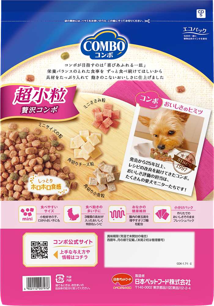 具材たっぷりごちそうコンボ!小さい粒と3種類の具材入り。グルメな超小型犬も大満足の特別なコンボ。栄養バランスのとれた食事をずっと食べ続けてほしいから、たっぷりの具材で飽きのこないおいしさに仕上げました。