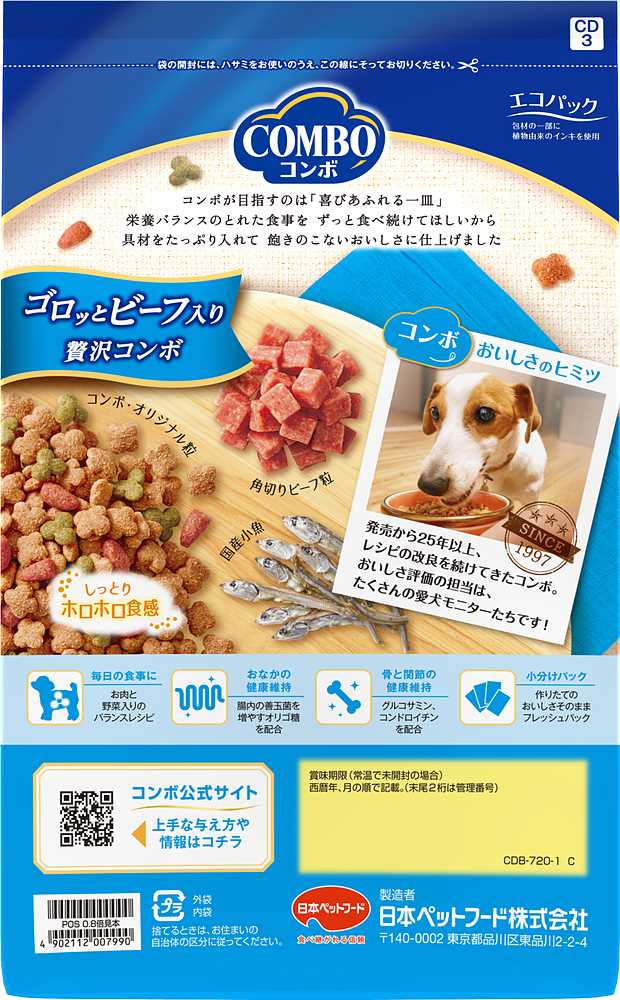 具材たっぷりごちそうコンボ!ホロホロ食感粒。愛犬が大好きなビーフ粒がゴロゴロと入った贅沢なコンボ。栄養バランスのとれた食事をずっと食べ続けてほしいから、たっぷりの具材で飽きのこないおいしさに仕上げました。