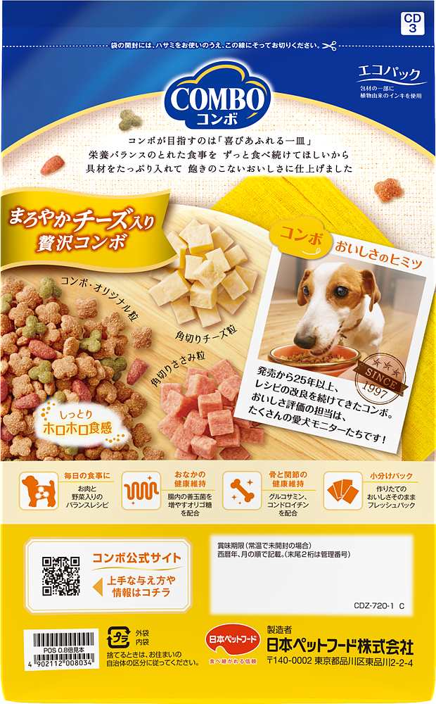 具材たっぷりごちそうコンボ!ホロホロ食感粒。愛犬が大好きなチーズ粒がゴロゴロと入った贅沢なコンボ。栄養バランスのとれた食事をずっと食べ続けてほしいから、たっぷりの具材で飽きのこないおいしさに仕上げました。