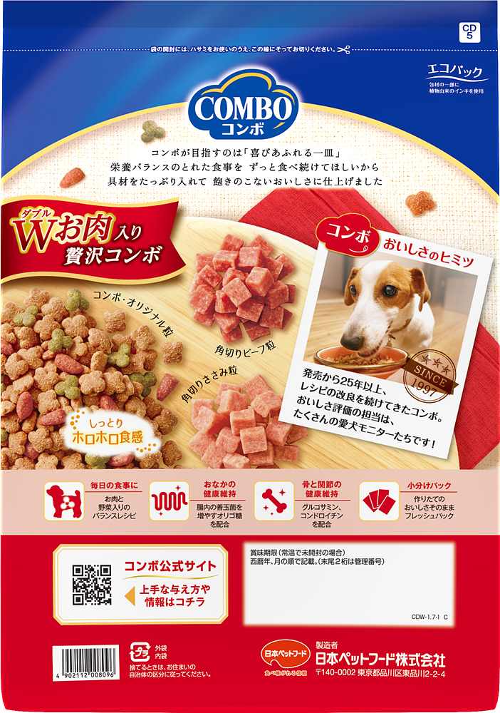 具材たっぷりごちそうコンボ!ホロホロ食感粒。残さず食べてほしいから、ビーフとささみ入りの贅沢なコンボ。栄養バランスのとれた食事をずっと食べ続けてほしいから、たっぷりの具材で飽きのこないおいしさに仕上げました。