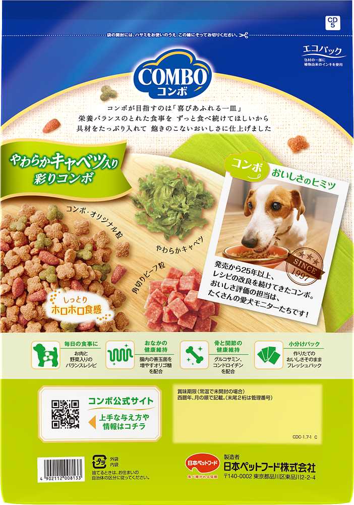 原材料穀類(トウモロコシ、小麦粉、脱脂米糠、コーングルテンフィード、小麦タンパク)、肉類(チキンミール、チキン、牛肉粉、豚肉粉、チキンレバーパウダー、ビーフ)、脱脂大豆、油脂類(動物性油脂、植物性油脂(オメガ-6脂肪酸含む))、野菜類(キャベツ、大麦若葉、カボチャ、トマト、ニンジン、ブロッコリー、ホウレンソウ、モロヘイヤ)、でん粉分解物、ビール酵母、食塩、セレン酵母、小魚粉末、オリゴ糖、カゼインホスホペプチド、プロピレングリコール、ミネラル類(カルシウム、リン、ナトリウム、クロライド、鉄、銅、マンガン、亜鉛、ヨウ素、コバルト)、グリセリン、pH調整剤、保存料(ソルビン酸カリウム、デヒドロ酢酸ナトリウム)、ソルビトール、ビタミン類(A、B2、B6、B12、D、E、パントテン酸、コリン)、膨張剤、酸化防止剤(エリソルビン酸ナトリウム、ミックストコフェロール、ローズマリー抽出物)、着色料(二酸化チタン、食用赤色102号、食用赤色106号、食用黄色4号、食用黄色5号、食用青色1号)、グルコサミン、アミノ酸類(アルギニン、メチオニン)、コンドロイチン