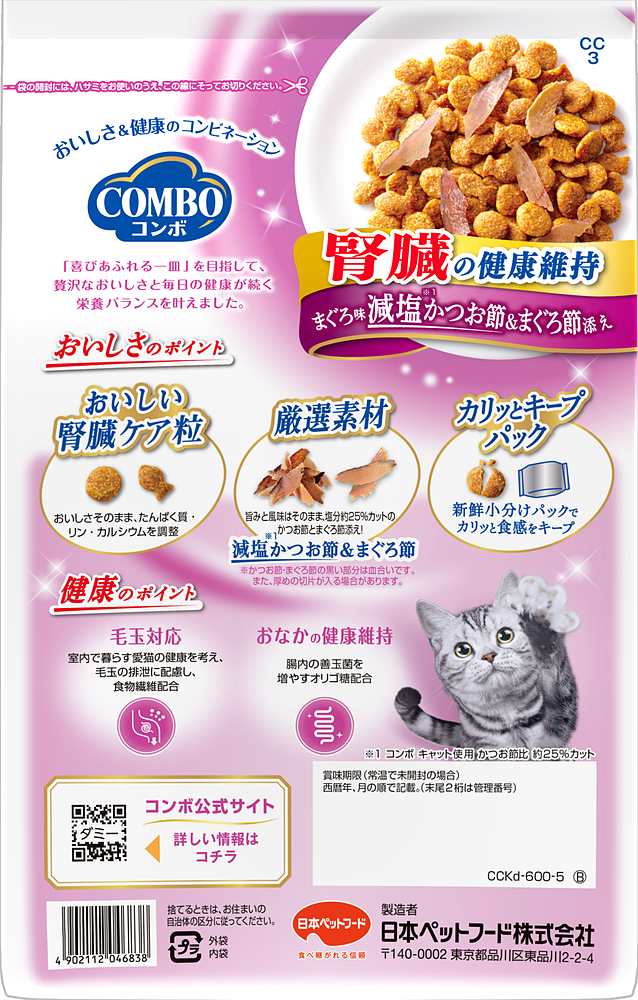おいしさそのままたんぱく質、リン、カルシウムを調整。まぐろ味に減塩かつお節&まぐろ節添え。