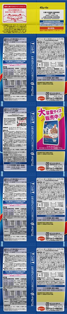 穀類(トウモロコシ、コーングルテンミール、小麦粉、パン粉、小麦タンパク)、肉類(チキンミール、牛肉粉、豚肉粉)、魚介類(フィッシュミール、フィッシュパウダー、魚肉すり身、にぼし、マグロエキス、カツオエキス、シラスパウダー)、油脂類(動物性油脂、植物性油脂)、ビール酵母(β-グルカン源)、でん粉、大豆タンパク、オリゴ糖、ミネラル類(カルシウム、リン、カリウム、ナトリウム、クロライド、銅、亜鉛、ヨウ素)、pH調整剤、アミノ酸類(タウリン、トリプトファン、メチオニン)、ビタミン類(A、B1、B2、B6、B12、D、E、K、ニコチン酸、パントテン酸、葉酸、コリン)、ソルビトール、増粘安定剤(加工でん粉)、調味料、トレハロース、酸化防止剤(ミックストコフェロール、ローズマリー抽出物)