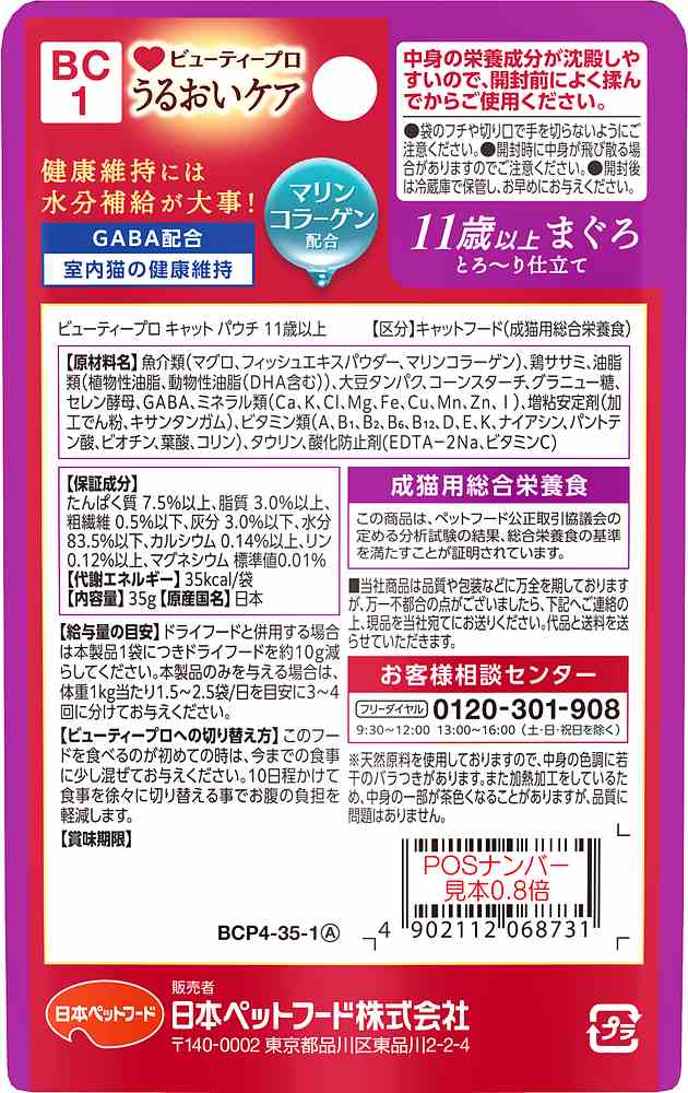魚介類(マグロ、フィッシュエキスパウダー、マリンコラーゲン)、鶏ササミ、油脂類(植物性油脂、動物性油脂(DHA含む))、大豆タンパク、コーンスターチ、グラニュー糖、セレン酵母、GABA、ミネラル類(Ca、K、Cl、Mg、Fe、Cu、Mn、Zn)、増粘安定剤(加工でん粉、キサンタンガム)、ビタミン類(A、B1、B2、B6、B12、D、E、K、ナイアシン、パントテン酸、ビオチン、葉酸、コリン)、タウリン、酸化防止剤(EDTA-2Na、ビタミンC)