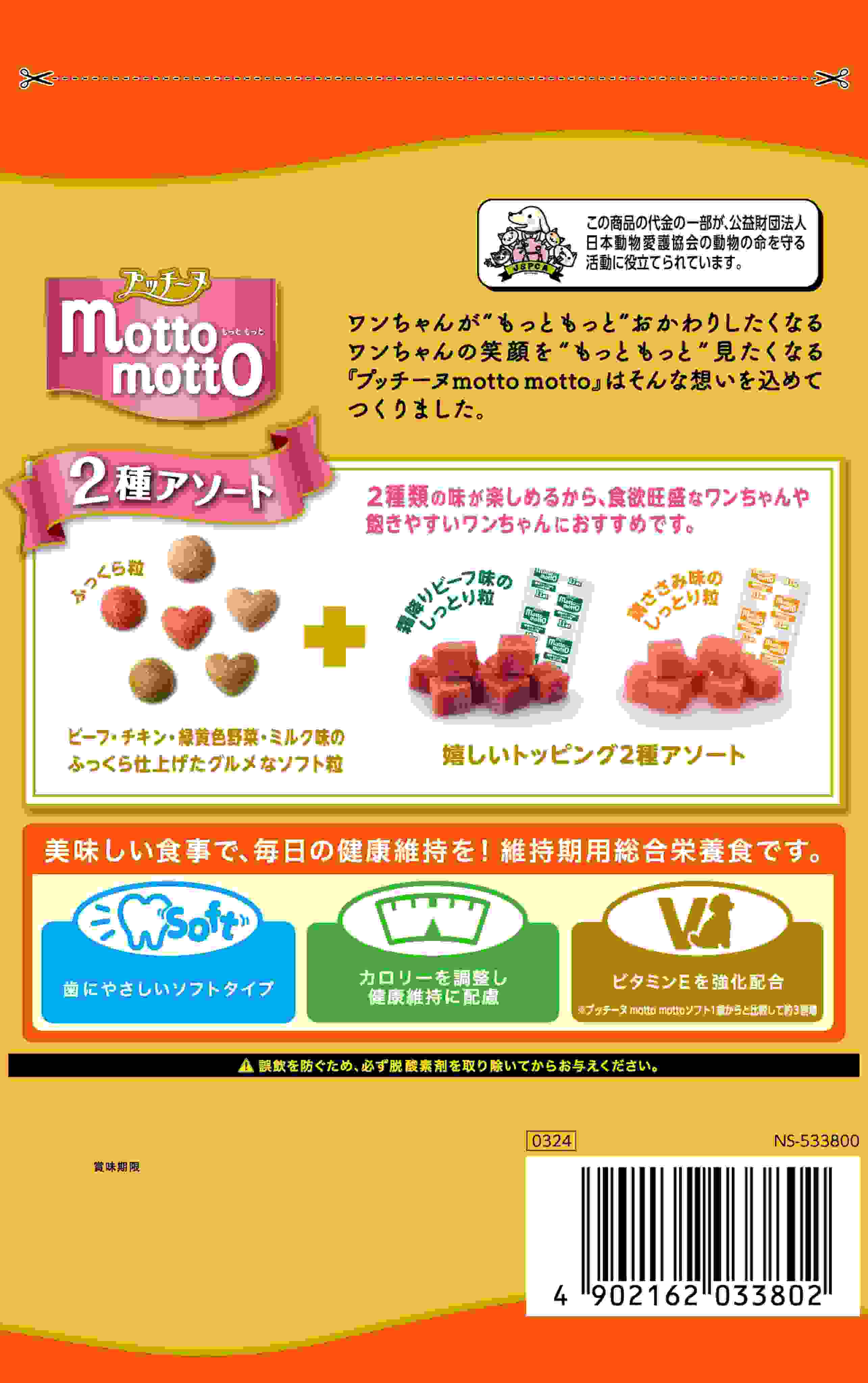 穀類(小麦粉、とうもろこし、小麦グルテン)、脱脂大豆、砂糖、肉類(鶏肉、鶏ささみ、鶏レバー)、動物性油脂、脱脂粉乳、かぼちゃ粉末、プロピレングリコール、ミネラル類(カルシウム、リン、ナトリウム、塩素、銅、マンガン、亜鉛、ヨウ素、コバルト)、ソルビトール、加工でんぷん、pH調整剤、グリセリン、保存料(ソルビン酸カリウム、デヒドロ酢酸ナトリウム)、リン酸塩(Na)、ビタミン類(A、D、E、B2、B12、パントテン酸、コリン)、香料、着色料(二酸化チタン、食用黄色4号、食用黄色5号、食用赤色106号、食用青色1号)、発色剤(亜硝酸ナトリウム)