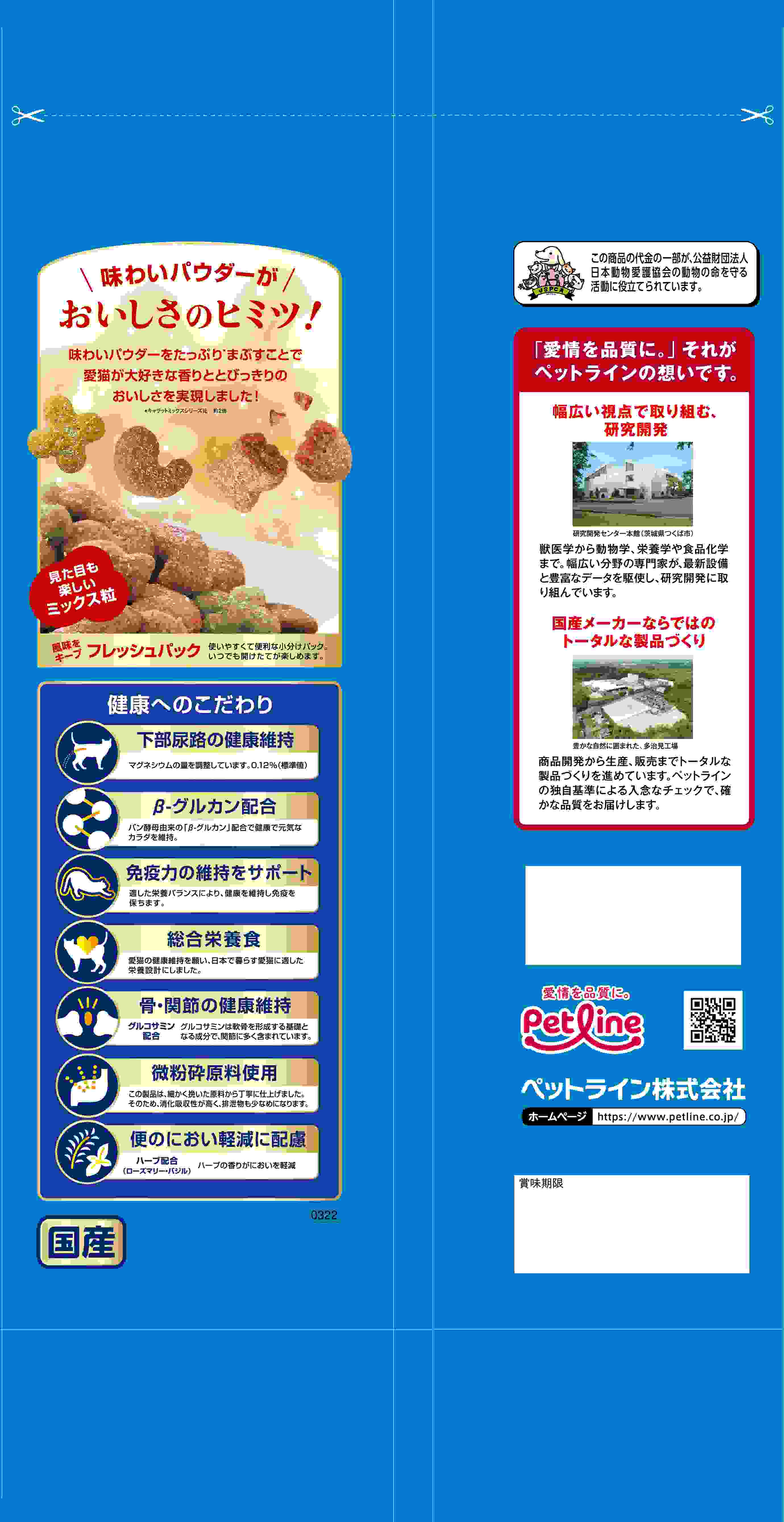 穀類(とうもろこし、小麦粉、コーングルテンミール、ホミニーフィード、等)、肉類(ミートミール、チキンミール、ささみパウダー、等)、油脂類(動物性油脂、等)、魚介類(フィッシュミール、フィッシュパウダー、かつおパウダー、等)、豆類(大豆ミール、等)、オリゴ糖、野菜類、ビール酵母、ビートパルプ、でんぷん類、馬鈴薯たんぱく、セルロース粉末、β-グルカン、ミルクカルシウム、グルコサミン、ローズマリー、バジル、ミネラル類(カルシウム、リン、カリウム、ナトリウム、塩素、鉄、銅、マンガン、亜鉛、ヨウ素)、アミノ酸類(メチオニン、タウリン)、ビタミン類(A、D、E、K、B1、B2、B6、パントテン酸、ナイアシン、葉酸、コリン)、食用赤色3号、食用黄色5号、食用青色1号、食用黄色4号、食用赤色102号、酸化防止剤(ローズマリー抽出物)