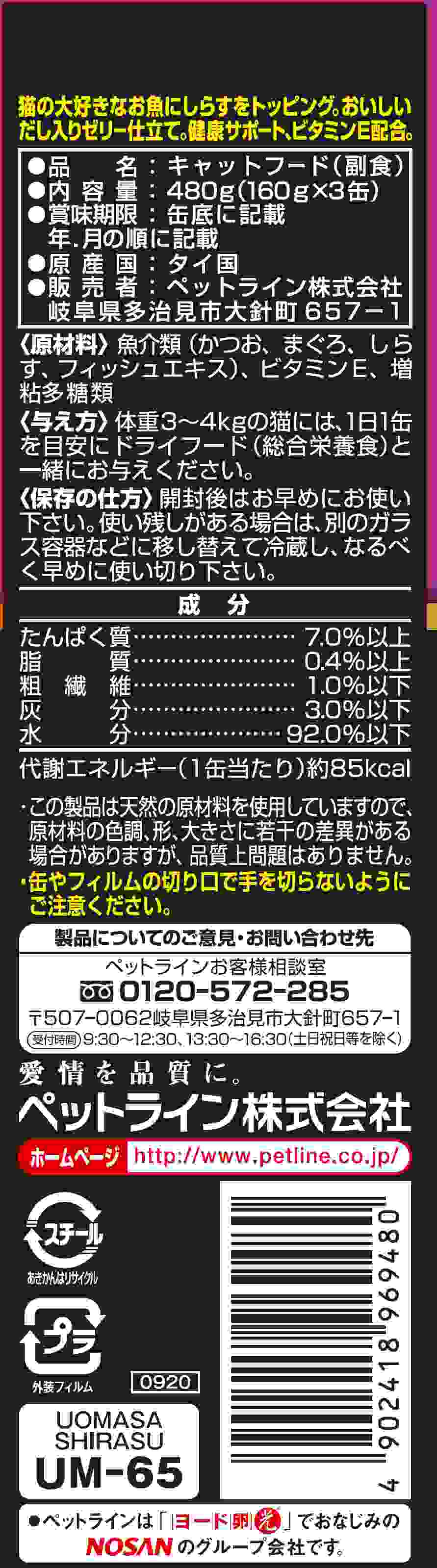 魚介類(かつお、まぐろ、しらす、フィッシュエキス)、ビタミンE、増粘多糖類