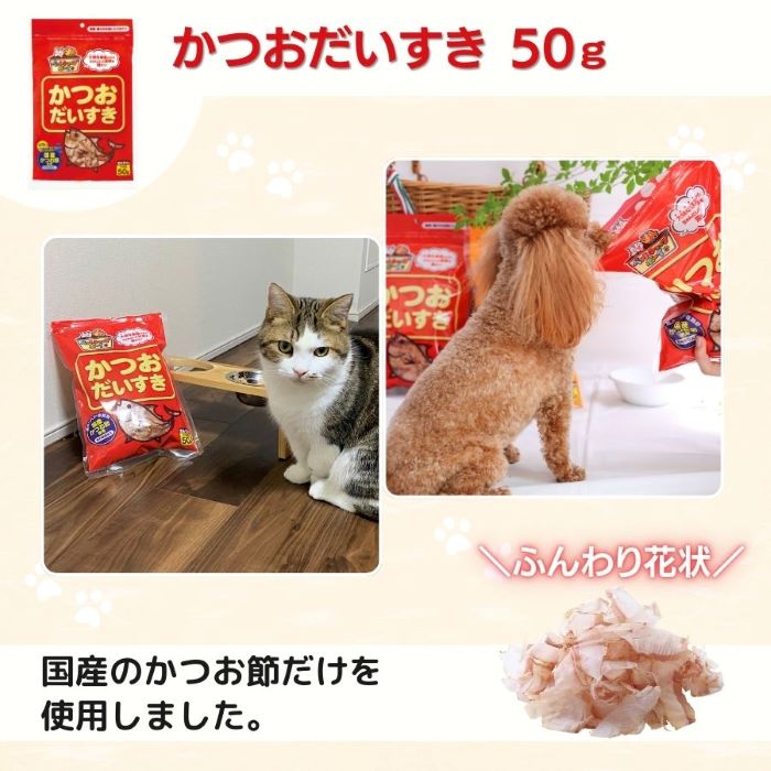 ●国産のかつお節を100%使用したおやつです。●薄くスライスしていますので食べやすく、おやつに最適です。●ドライタイプ・ウェットタイプのペットフード等へのふりかけ用としてもお与えいただけます。