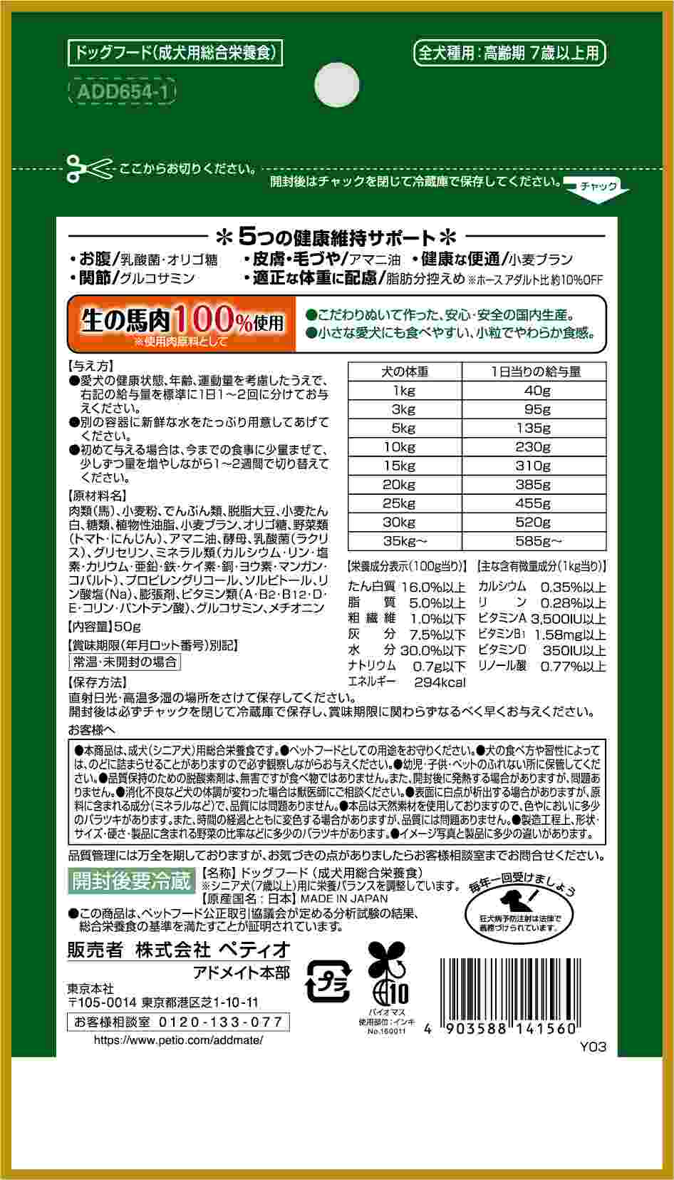 素材の旨味が活きたソフトタイプの国産プレミアムドッグフード。単一種の動物性たん白質を使用し、食物アレルギーに配慮。「すこやかな健康維持」を願うアダルトのために4つ(お腹、皮膚・毛づや、健康な便通、健康で元気なカラダ)の健康維持サポート。やわらかセミモイストタイプ、食いつきバツグン!生の馬肉と野菜を使った2層タイプ。小袋タイプでお試しにも最適!