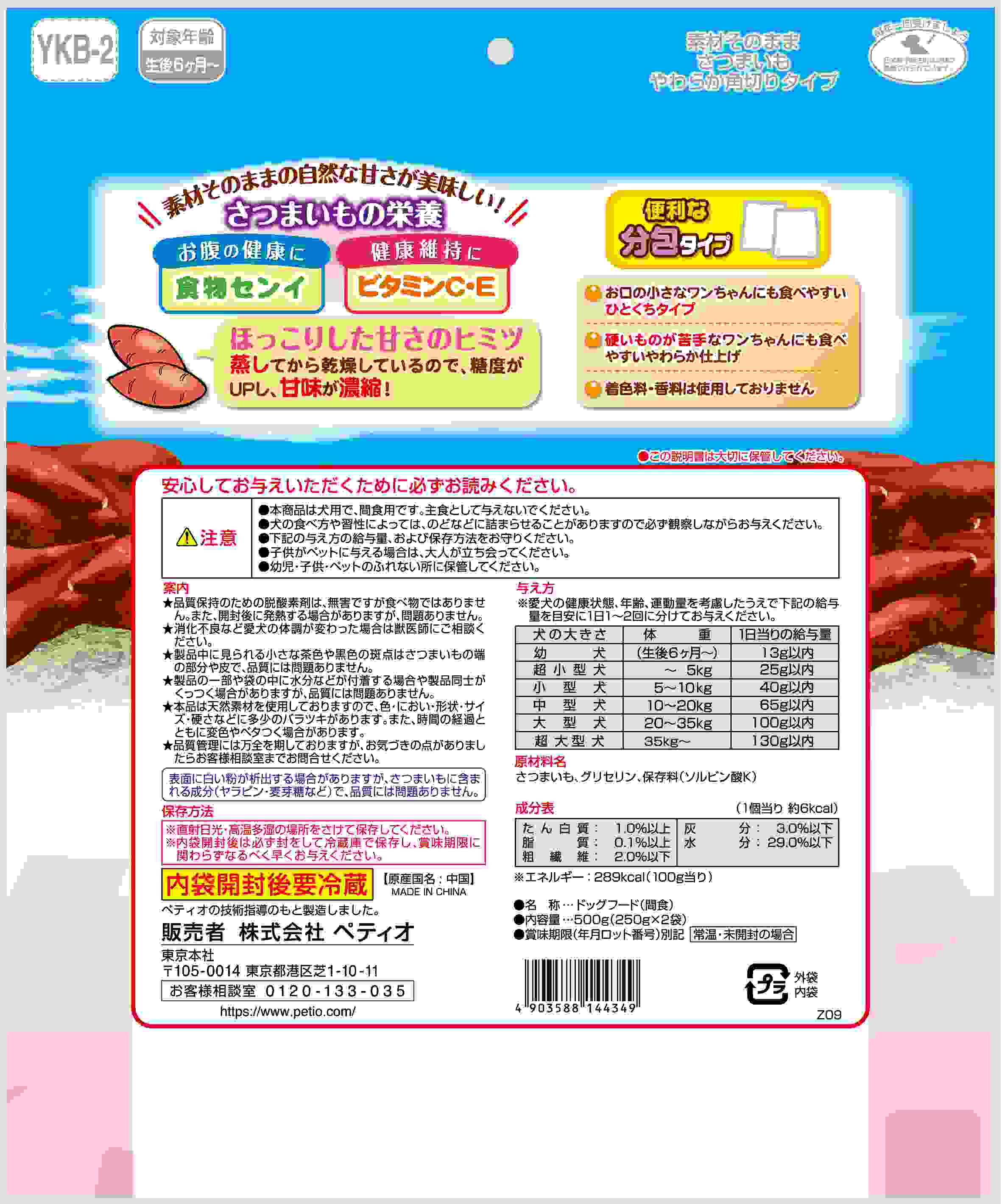 食物センイやビタミンC・Eを含むさつまいもを蒸してから乾燥しているので、糖度がUPし甘みが濃縮されています。お口の小さなワンちゃんにも食べやすいひとくちタイプで、硬いものが苦手なワンちゃんにも食べやすいやわらか仕上げ。着色料・香料無添加。便利な2袋分包。